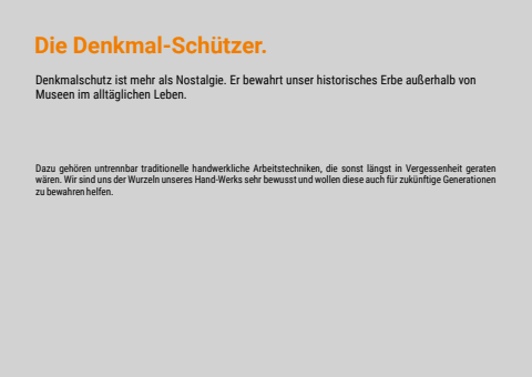 Die Denkmal-Sch%u00fctzer.Denkmalschutz ist mehr als Nostalgie. Er bewahrt unser historisches Erbe au%u00dferhalb von Museen im allt%u00e4glichen Leben.Dazu geh%u00f6ren untrennbar traditionelle handwerkliche Arbeitstechniken, die sonst l%u00e4ngst in Vergessenheit geraten w%u00e4ren. Wir sind uns der Wurzeln unseres Hand-Werks sehr bewusst und wollen diese auch f%u00fcr zuk%u00fcnftige Generationen zu bewahren helfen.