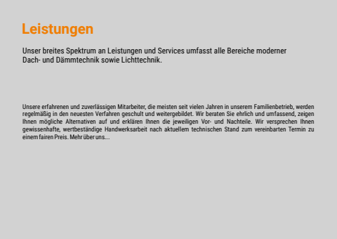 LeistungenUnser breites Spektrum an Leistungen und Services umfasst alle Bereiche moderner Dach- und D%u00e4mmtechnik sowie Lichttechnik. Unsere erfahrenen und zuverl%u00e4ssigen Mitarbeiter, die meisten seit vielen Jahren in unserem Familienbetrieb, werden regelm%u00e4%u00dfig in den neuesten Verfahren geschult und weitergebildet. Wir beraten Sie ehrlich und umfassend, zeigen Ihnen m%u00f6gliche Alternativen auf und erkl%u00e4ren Ihnen die jeweiligen Vor- und Nachteile. Wir versprechen Ihnen gewissenhafte, wertbest%u00e4ndige Handwerksarbeit nach aktuellem technischen Stand zum vereinbarten Termin zu einem fairen Preis. Mehr %u00fcber uns...