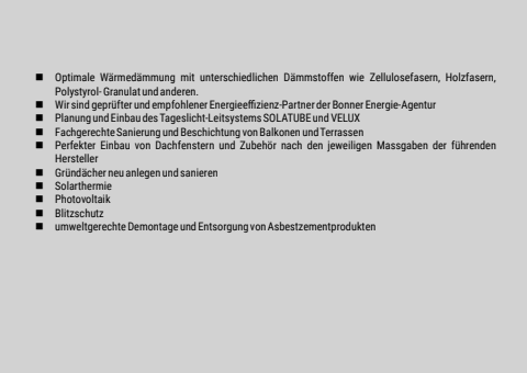 %uf06e Optimale W%u00e4rmed%u00e4mmung mit unterschiedlichen D%u00e4mmstoffen wie Zellulosefasern, Holzfasern, Polystyrol- Granulat und anderen.%uf06e Wir sind gepr%u00fcfter und empfohlener Energieeffizienz-Partner der Bonner Energie-Agentur%uf06e Planung und Einbau des Tageslicht-Leitsystems SOLATUBE und VELUX%uf06e Fachgerechte Sanierung und Beschichtung von Balkonen und Terrassen%uf06e Perfekter Einbau von Dachfenstern und Zubeh%u00f6r nach den jeweiligen Massgaben der f%u00fchrenden Hersteller%uf06e Gr%u00fcnd%u00e4cher neu anlegen und sanieren%uf06e Solarthermie%uf06e Photovoltaik%uf06e Blitzschutz%uf06e umweltgerechte Demontage und Entsorgung von Asbestzementprodukten